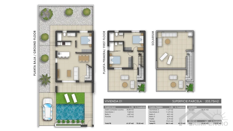 Dit nieuwbouwcomplex bestaat uit villa's elk met 3 slaapkamers en 3 badkamers. Op de benedenverdieping van bijna 90m² bevindt zich de open keuken is voorzien van gelakte boven- en onderkasten in een eigentijdse kleurencombinatie, een hoogwaardig porseleinen tegelwerkblad en moderne apparatuur, waaronder een keramische kookplaat, ingebouwde oven en afzuigkap; de woonkamer biedt directe toegang tot een terras met privézwembad, perfect om te ontspannen en te genieten van het prachtige mediterrane klimaat.