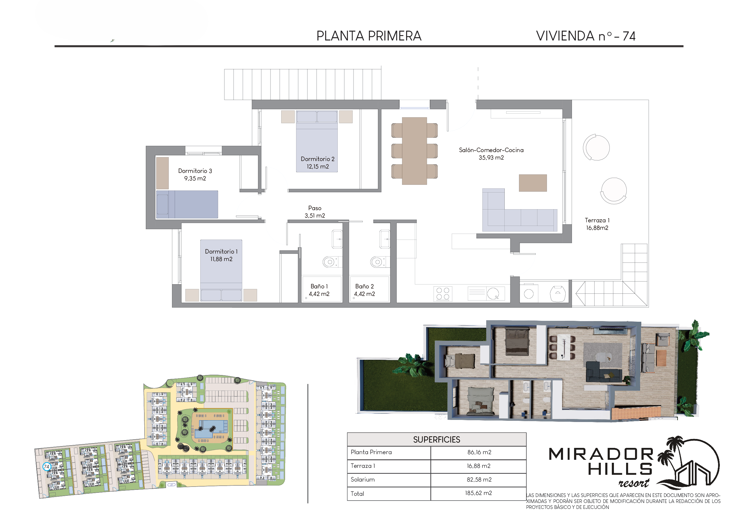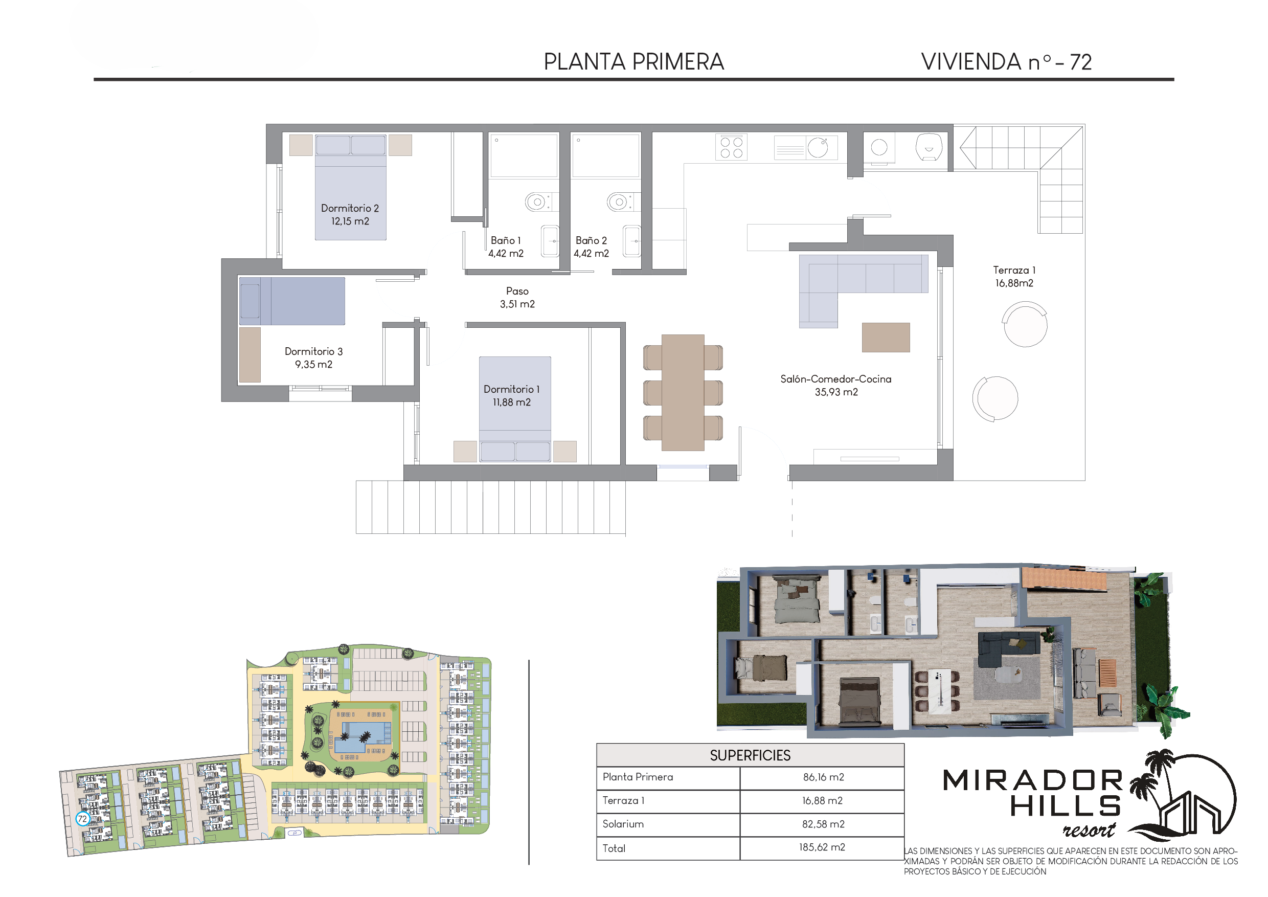 Zoals eerder vermeld is dit project het "neusje van de zalm" in de Costa Blanca. De penthouses, gelegen op de eerste verdieping, bevatten elk 3 slaapkamers, 2 badkamers en eigen parkeerplaats. Het solarium biedt jou een prachtig zicht op de Middellandse zee en indien gewenst is er de mogelijkheid een privé zwembad te laten bijbouwen.