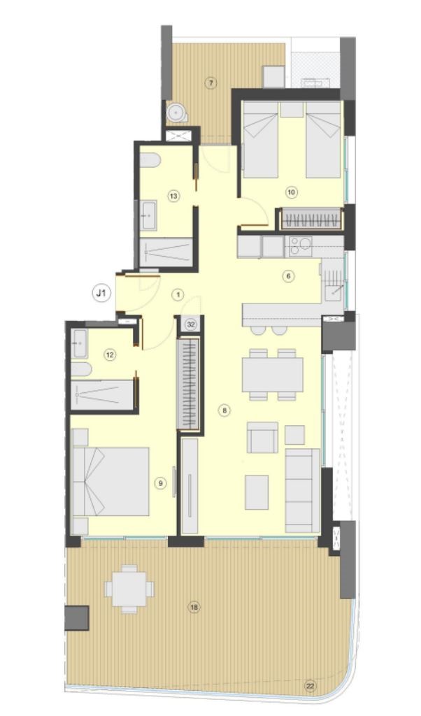 Deze woning is gelegen op een tussenverdieping en is voorzien van 2 slaapkamers met 2 badkamers. De woning is gelegen in een groot appartementsgebouw van in totaal 72 woningen.
