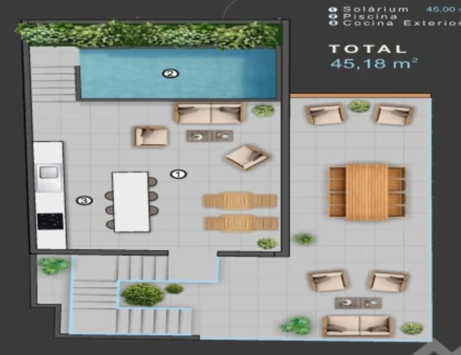 Nog een verdieping hoger bereik je het solarium van 45m². Daar is er een buitenkeuken gelegen én optioneel een zwembad.