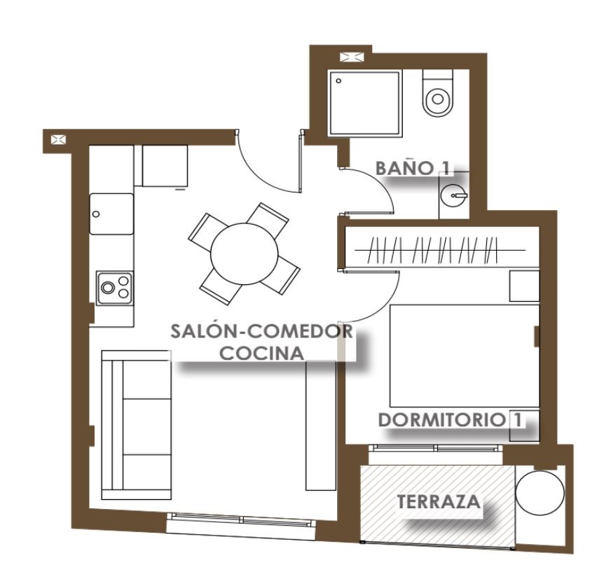 De slaapkamer heeft rechtstreekse toegang tot het terras van 4 m² en is uitgerust met een inbouwkast met hangrekken, legplanken en lades. De badkamer is volledig uitgerust met een wastafel en bijpassend meubel, douche en toilet. Het terras is een ideale plek om te genieten van frisse buitenlucht én een lichte zeebries die Playa del Cura typeert.