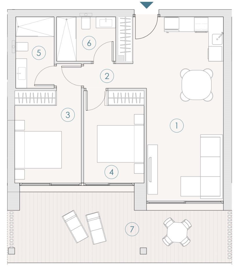 Dit appartement beschikt over 2 slaapkamers en 2 badkamers en is ontworpen voor comfortabel wonen met een sterke focus op licht, ruimte en buitenleven. Bij het binnenkomen kom je meteen terecht in de open leefruimte met keuken. De keuken is volledig uitgerust met alle elektrische toestellen en biedt dankzij de open indeling een directe verbinding met de woonkamer. Grote schuiframen zorgen voor veel natuurlijke lichtinval en geven rechtstreeks uit op het privéterras van 23m².