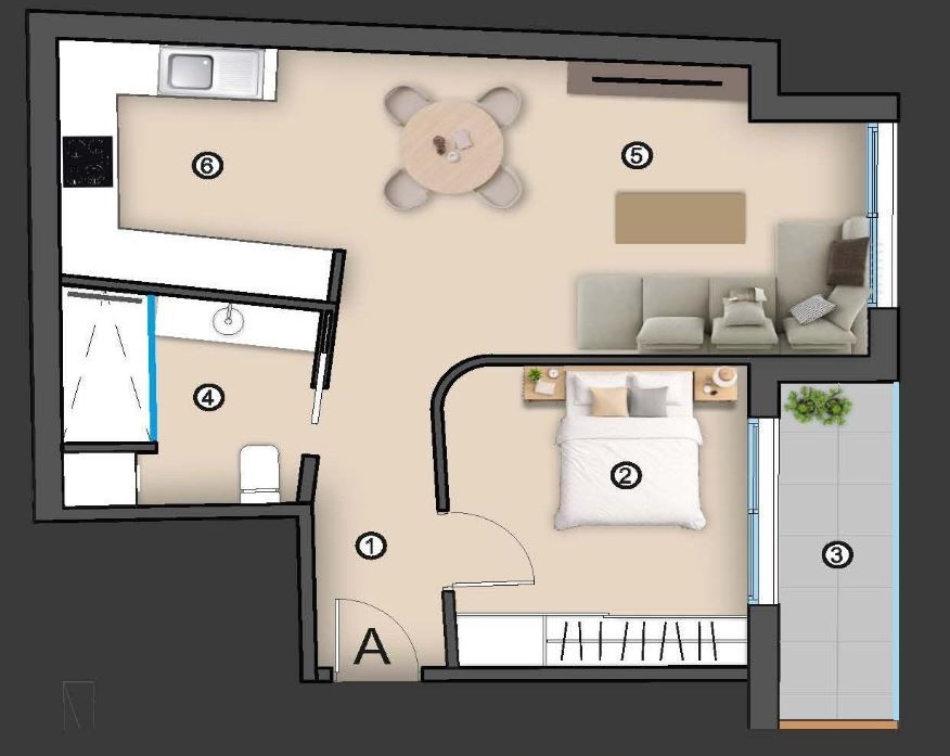 Dit appartement is gelegen een tussenverdieping ( eerste, tweede of derde verdieping) en is voorzien van 1 slaapkamer en 1 badkamer. We nemen even een wandeling doorheen de woning. Bij het betreden van de woning bereik je de inkomhal. Deze inkomhal loopt uit op de woonkamer met open keuken.