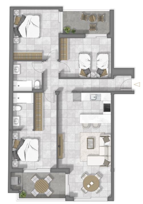 Dit tussenappartement beschikt over 3 slaapkamers en 2 badkamers, een lichtrijke leefruimte met open keuken en kookeiland en twee terrassen samen goed voor 8 m². De hoofdslaapkamer heeft een ensuite badkamer en privéterras, terwijl de andere twee slaapkamers een badkamer delen. Alle slaapkamers zijn voorzien van inbouwkasten en beide badkamers zijn volledig afgewerkt met douche, meubel, toilet en spiegel.