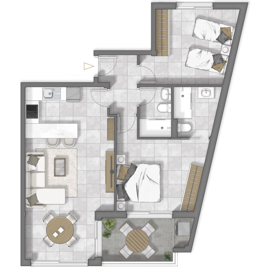 Dit tussenappartement beschikt over 2 slaapkamers en 2 badkamers, een lichtrijke leefruimte met open keuken en kookeiland en een terras van 8 m². De hoofdslaapkamer heeft een ensuite badkamer en privéterras. Alle slaapkamers zijn voorzien van inbouwkasten en beide badkamers zijn volledig afgewerkt met douche, meubel, toilet en spiegel.