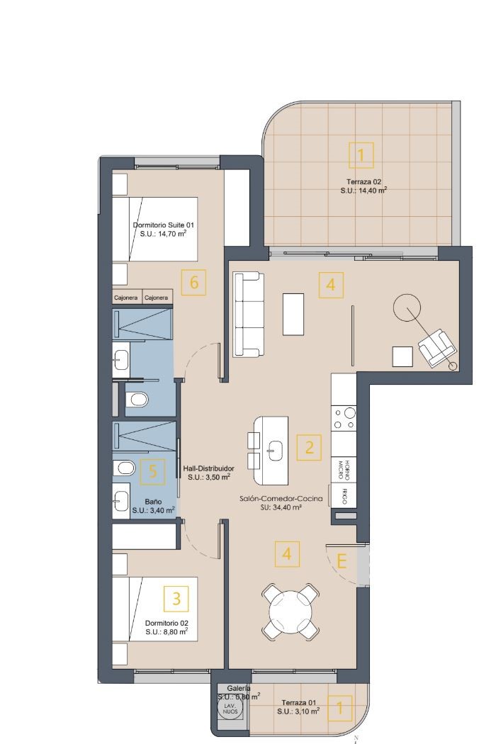Dit moderne appartement in Los Alcázares biedt een lichtrijke leefruimte met open keuken en kookeiland, drie slaapkamers en twee badkamers. Dankzij de doordachte indeling en grote schuiframen geniet je overal van natuurlijk licht en een vlotte overgang tussen binnen- en buitenruimte.