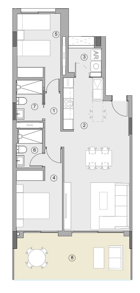 Deze woning beschikt over 2 slaapkamers en 2 badkamers, met een open leefruimte die rechtstreeks verbonden is met het terras via grote schuiframen. De keuken is volledig uitgerust met keramische kookplaat, dampkap, oven, magnetron, koelkast, diepvriezer en vaatwasser. Aansluitend aan de keuken bevindt zich een praktische wasruimte met aerothermische boiler en aansluitingen voor wasmachine en droogkast. Beide badkamers zijn volledig afgewerkt en voorzien van vloerverwarming.