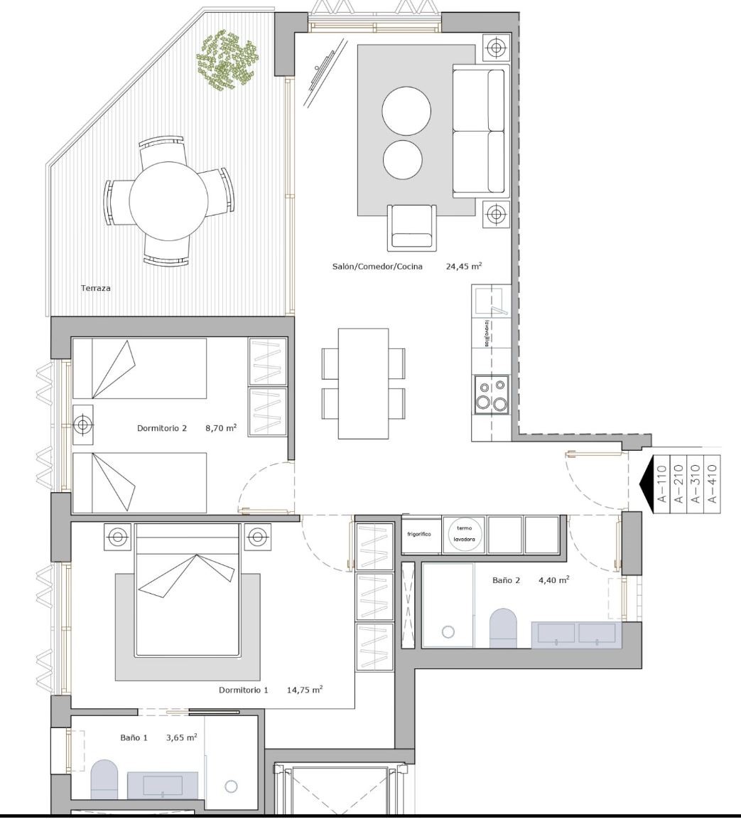 | Type woning | Aantal slaapkamers / badkamers | Bebouwde oppervlakte | Terras in m² | Prijs |
