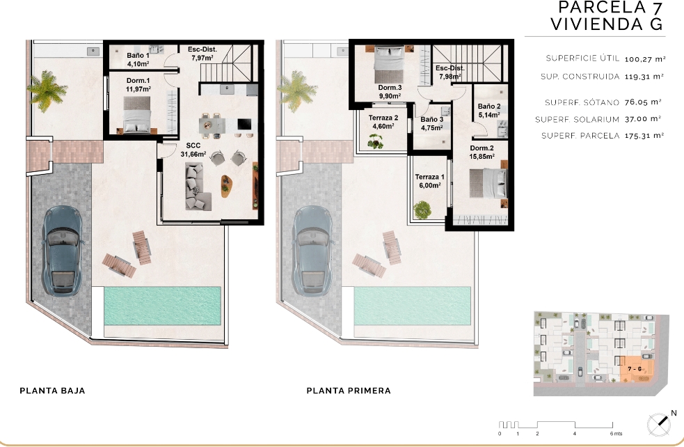 In het charmante stadje Benijófar wordt dit exclusieve nieuwbouwproject gerealiseerd, bestaande uit slechts 9 moderne halfvrijstaande villa’s. Elk van deze woningen biedt een eigentijdse leefomgeving met 3 ruime slaapkamers, 3 stijlvolle badkamers, een kelderonderbouw van ruim70m² voor extra opslag of werkruimte, een privézwembad en parkeergelegenheid op eigen terrein. Bovendien geniet je van een prachtig solarium van bijna 40m² op het dak, perfect om van de zon en het uitzicht te genieten.