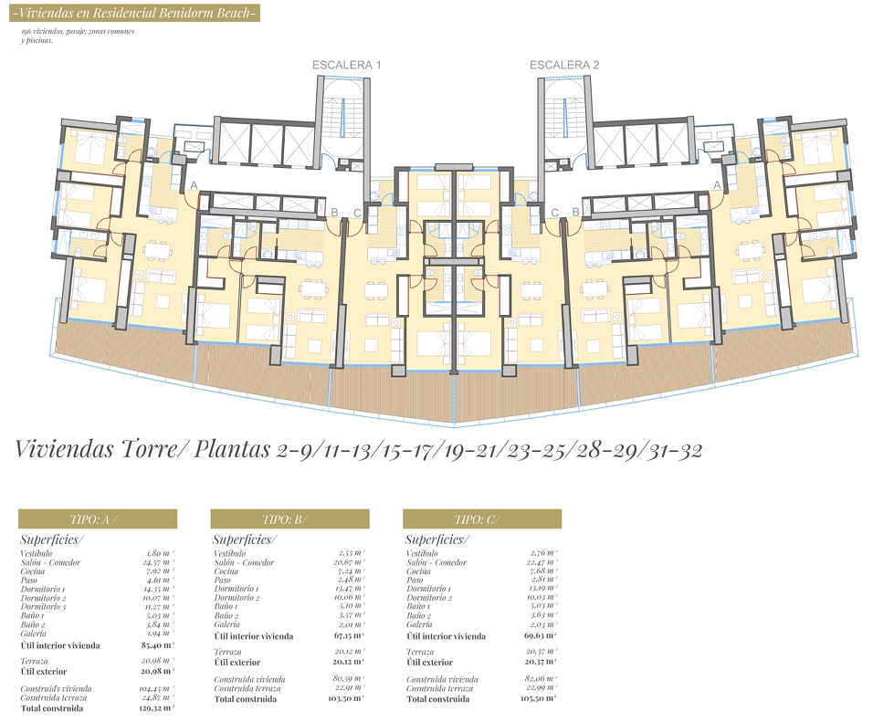 Stijlvol wonen in een eigentijdse trendy wolkenkrabber in het hart van Benidorm: Deze appartementen zijn gelegen op een tussenverdieping en bevatten 3 slaapkamers en 2 badkamers. De lichtrijke leefruimte bestaat uit een gezellige zithoek die nadeloos aansluit op de moderne open keuken die voorzien is van alle benodigde keukentoestellen. De keuken heeft praktische opbergkasten en een trendy kookeiland dat zich uitstekend leent als ontbijttafel. De slaapkamers bieden plaats voor 2-persoonsbedden en hebben stijlvolle inbouwkasten waardoor geen enkele ruimte verloren gaat en schenken een fantastisch zicht op de kustlijn. De badkamers ogen uiterst hedendaags en zijn voorzien van een kwalitatieve douche met bijpassend badkamermeubel-en toilet. Het absolute hoogtepunt van deze appartementen is ongetwijfeld de ruime terrassen met glazen omheining die panoramisch zeezicht schenken. De appartementen worden geleverd met een voorziene parkeerplaats in de garage en een extra bergruimte.