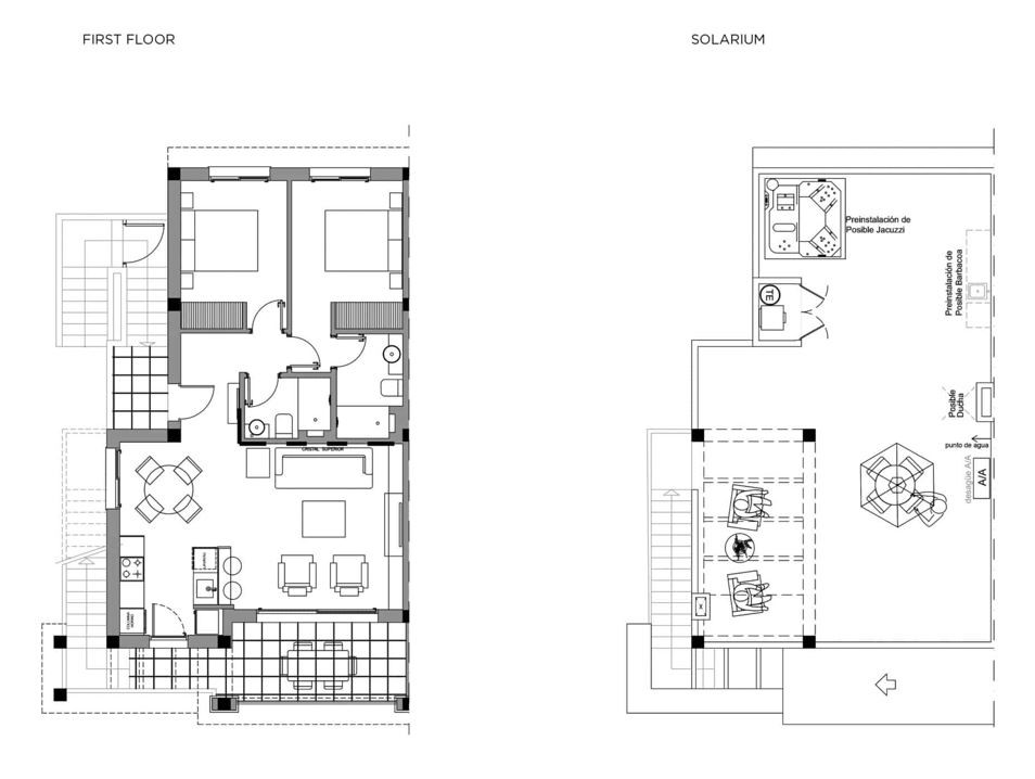 Deze bungalow bevindt zich op de eerste verdieping en beschikt over 2 slaapkamers en 2 badkamers. Via een buitentrap bereik je de woning, waar een ruime leefruimte met open keuken op je wacht. De keuken heeft een pré-installatie zonder toestellen, zodat je zelf je voorkeuren kunt bepalen. Grote schuiframen verbinden de woonkamer met het terras van 10m², een ideale plek om te ontspannen en te genieten van het Spaanse klimaat.
