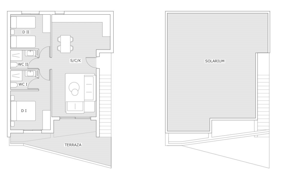 De woning is gelegen op de bovenste verdieping en heeft een terras van 16m². Een verdieping hoger, bereik je het solarium van 71m². Dankzij deze grote buitenruimtes kan je optimaal genieten van de Spaanse zon.