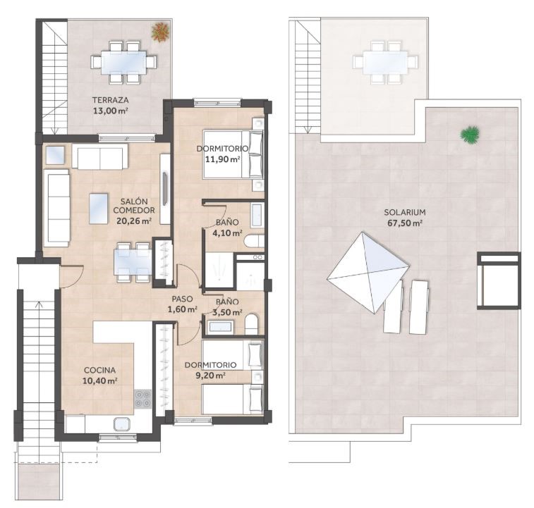 Op de bovenste verdieping is het solarium gelegen van 67.5m². Hier kan je de hele dag door genieten van de zon én van de meest prachtige zichten. Beleef een leuke tijd met je familie en vrienden onder de Spaanse zon!