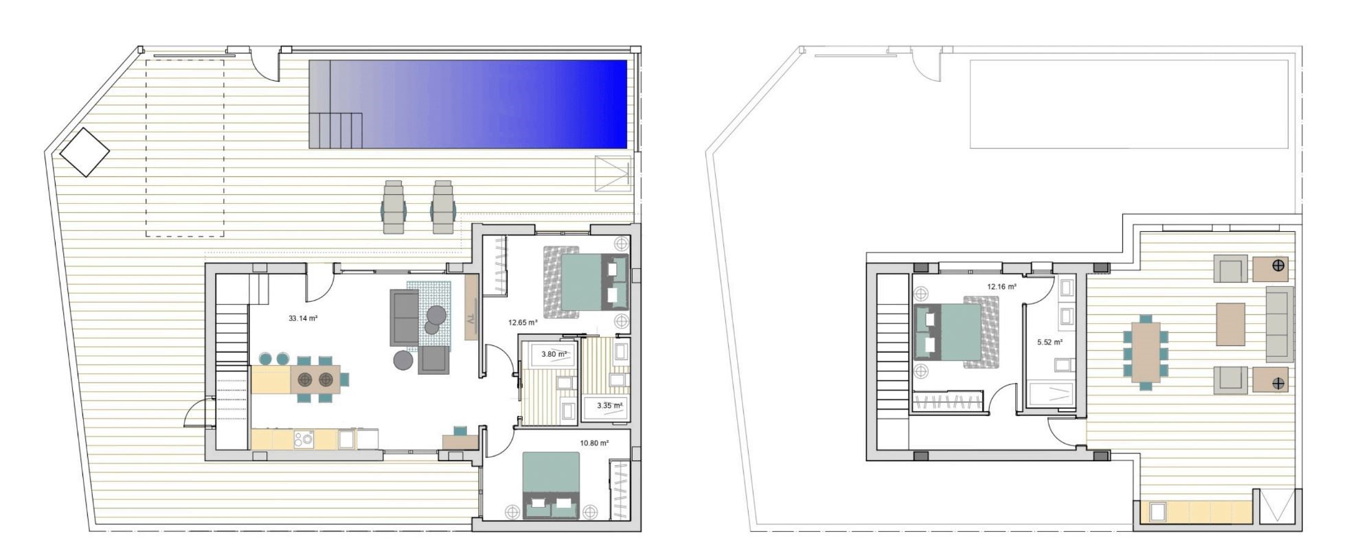 Het ontwerp van de villa's werd geïnspireerd op geografische vormgeving waardoor deze woningen een uiterst hedendaagse uitstraling hebben die iedereen zal bekoren: Treed binnen in jouw moderne droomwoning. Deze hoekvilla bevatten 3 slaapkamers, 3 badkamers, zonovergoten terrassen, een privé zwembad en prachtig solarium waar wij nu al jaloers op zijn na het bekijken van de foto's. De woningen zijn gebouwd in een omheind, beveiligd resort met alle benodigde recreatiemogelijkheden voor jong en oud. Geniet van het prachtig natuurgebied en ga gerust golfen, padellen of petanquen: in dit unieke woonresort kan het allemaal zonder de auto of fiets te moeten bovenhalen. De leefruimte bestaat uit de woonkamer en een volledig uitgeruste open keuken: alle benodigde toestellen zijn reeds aanwezig en klaar voor gebruik.