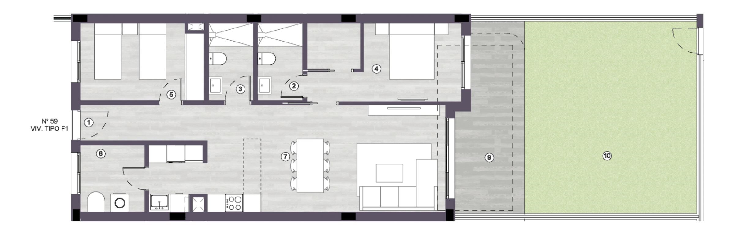 Deze woning is gelegen op de gelijkvloerse verdieping en voorzien van 2 slaapkamers met 2 badkamers. We nemen even een wandeling doorheen de woning. Bij het betreden van de woning kom je terecht in een inkomhal, die uitkomt op de open leefruimte met keuken.
