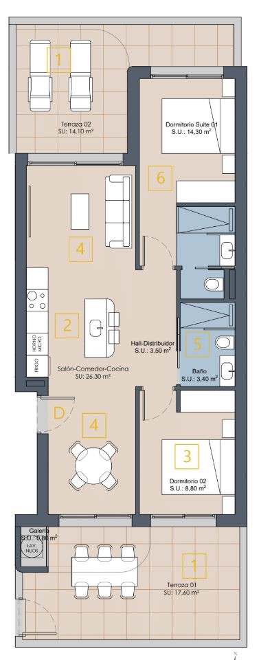 Dit moderne gelijkvloers appartement in Los Alcázares biedt een lichtrijke leefruimte met open keuken en kookeiland, twee slaapkamers en twee badkamers. Dankzij de doordachte indeling en grote schuiframen geniet je overal van natuurlijk licht en een vlotte overgang tussen binnen- en buitenruimte.