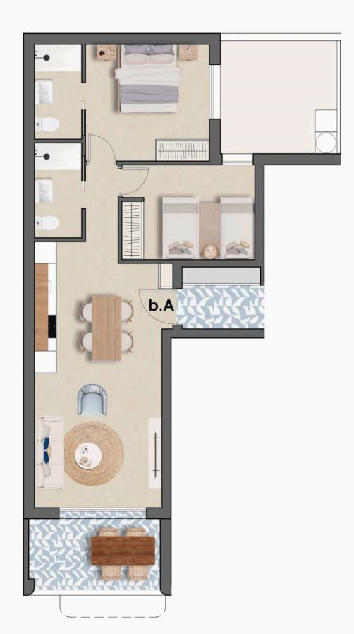 Deze gelijkvloerse woning beschikt over 2 slaapkamers en 2 badkamers. De leefruimte met open keuken is voorzien van keramische kookplaat, oven en dampkap, en geeft via een groot schuifraam uit op het terras van 15 m². De slaapkamer heeft ingebouwde kasten en directe toegang tot hetzelfde terras. De badkamer is uitgerust met douche, toilet, wastafel met meubel en spiegel.