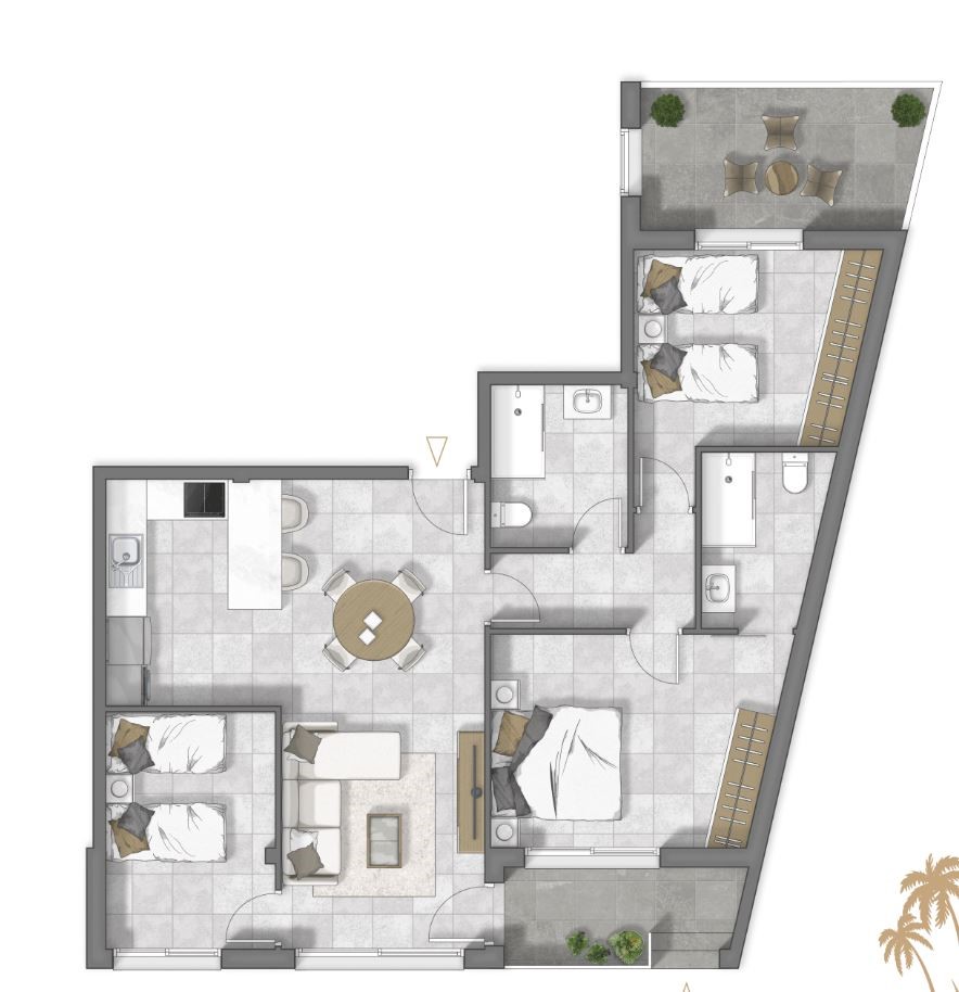 Dit gelijkvloers appartement beschikt over 3 slaapkamers en 2 badkamers, een lichtrijke leefruimte met open keuken en kookeiland en twee terrassen samen goed voor 13 m². De hoofdslaapkamer heeft een ensuite badkamer en privéterras, terwijl de andere twee slaapkamers een badkamer delen. Alle slaapkamers zijn voorzien van inbouwkasten en beide badkamers zijn volledig afgewerkt met douche, meubel, toilet en spiegel.