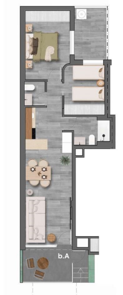 Dit gelijkvloerse appartement beschikt over 2 slaapkamers en 1 badkamer. De lichte woonkamer met open keuken, uitgerust met keramische kookplaat, oven en dampkap, geeft via schuiframen toegang tot het terras van 6 m². De hoofdslaapkamer heeft een privépatio van 5 m², wat zorgt voor extra lichtinval en een aangename sfeer. De badkamer is volledig afgewerkt met douche, wastafel met meubel, toilet en spiegel. Aansluitend aan de hoofdslaapkamer is er een gastentoilet gelegen met wastafel.