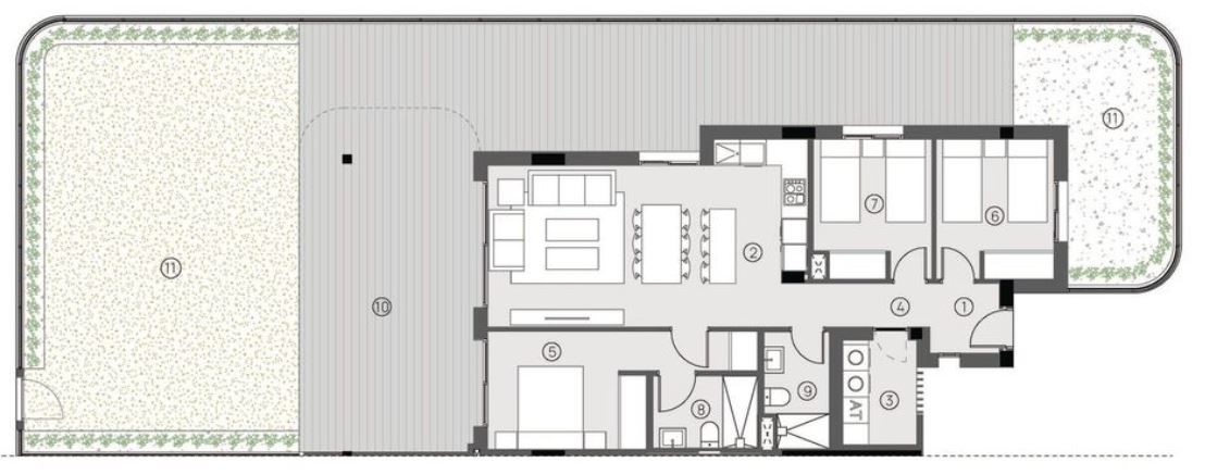 Deze woning is gelegen op de gelijkvloerse verdieping en is voorzien van 3 slaapkamers met 2 badkamers. We nemen even een wandeling doorheen de woning. Bij het betreden van de woning kom je terecht in de inkomhal, die uitkomt in de ruime leefruimte. De ruime leefruimte kent een open keuken, voorzien van onder- en bovenkasten én een geïntegreerde dampkap.