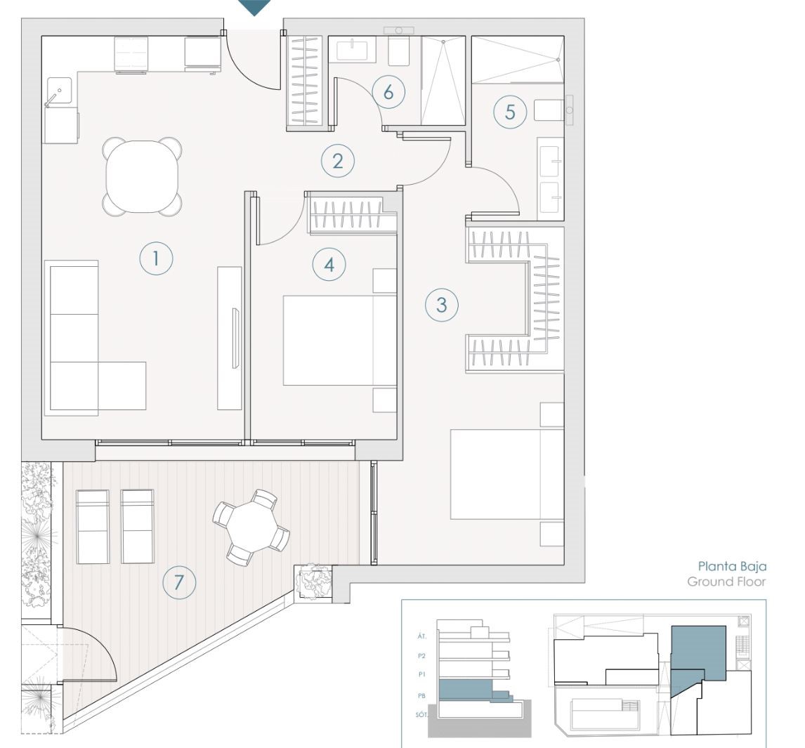 Het terras vormt een volwaardig verlengstuk van de leefruimte en is bereikbaar vanuit zowel de woonkamer als beide slaapkamers. Dankzij de gelijkvloerse ligging en de brede raampartijen geniet je hier optimaal van het mediterrane buitenleven. Extra comfort wordt geboden door onder meer dubbele beglazing, goede ventilatie, een aerothermische boiler voor sanitair warm water en pré-installatie voor airconditioning. Dit appartement is perfect geschikt als vaste woonst, tweede verblijf of kwalitatieve investering in Benijófar.