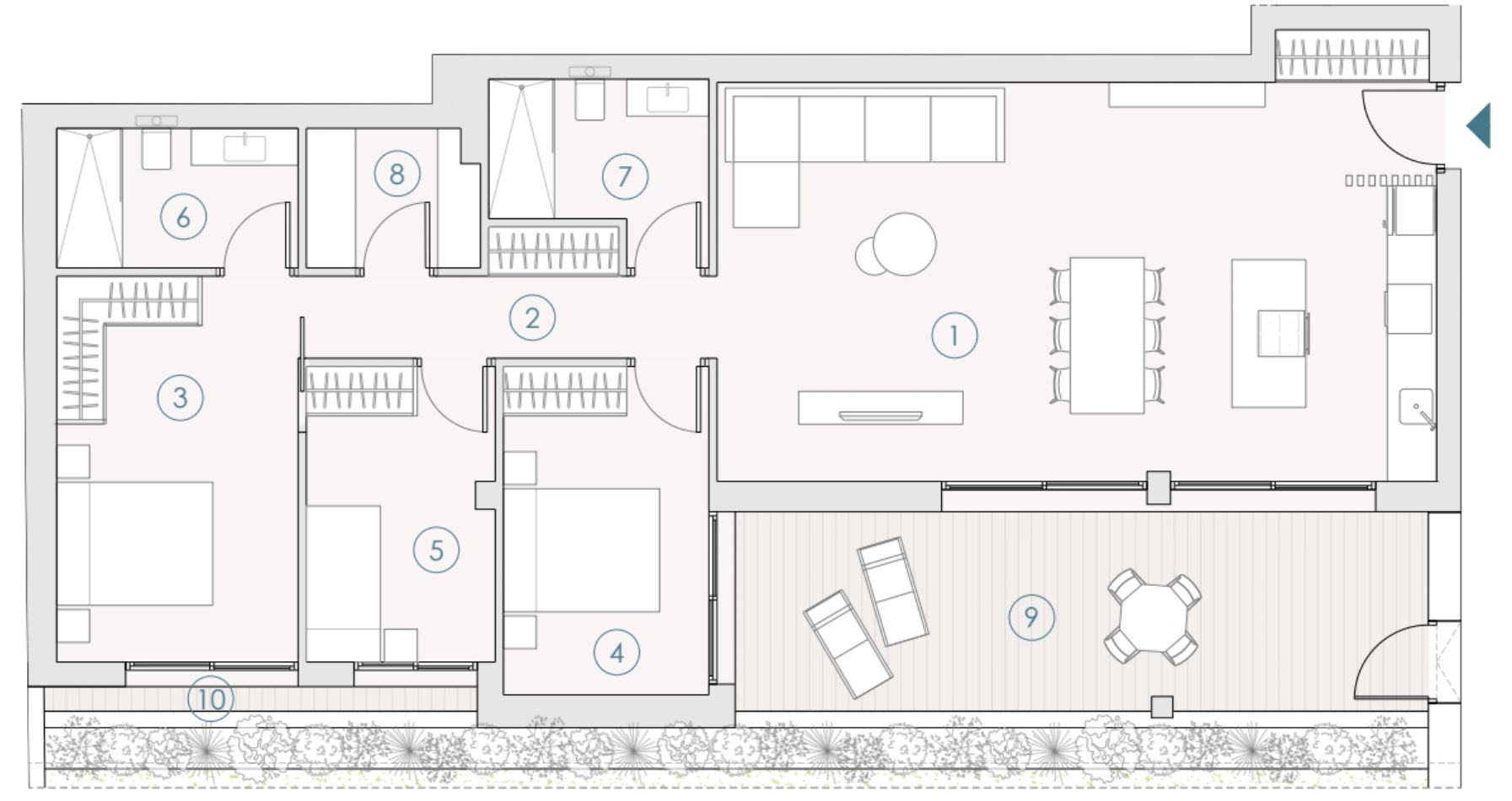 Deze woning is gelegen op de gelijkvloerse verdieping en heeft een privéterras van 25m². Zowel de woonkamer als de slaapkamers zijn via grote schuiframen verbonden met het terras.