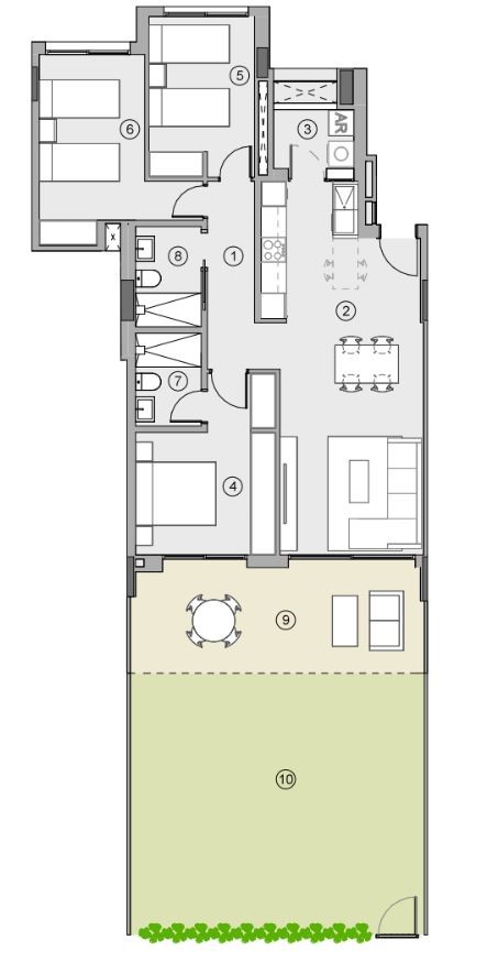 De hoofdslaapkamer heeft een badkamer-ensuite en rechtstreekse toegang tot de tuin, terwijl de tweede en derde slaapkamer eveneens een badkamer delen. Dankzij het aangelegde terras van 17 m² en de groene tuin van 42 m² geniet je van een royale buitenruimte die ideaal is om te ontspannen, te loungen of te genieten van de Spaanse zon. De woning voelt ruim aan en combineert comfort met een doordachte indeling.