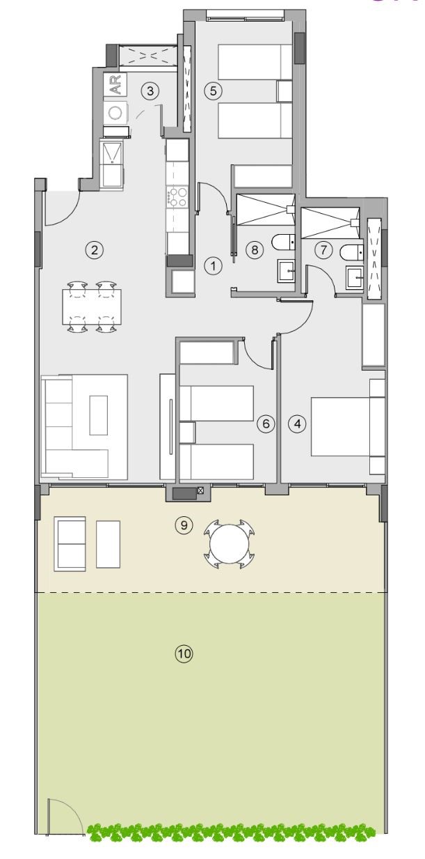 De hoofdslaapkamer heeft een badkamer-ensuite en rechtstreekse toegang tot de tuin, terwijl de tweede en derde slaapkamer eveneens een badkamer delen. Dankzij het aangelegde terras van 22 m² en de groene tuin van 55 m² geniet je van een royale buitenruimte die ideaal is om te ontspannen, te loungen of te genieten van de Spaanse zon. De woning voelt ruim aan en combineert comfort met een doordachte indeling.