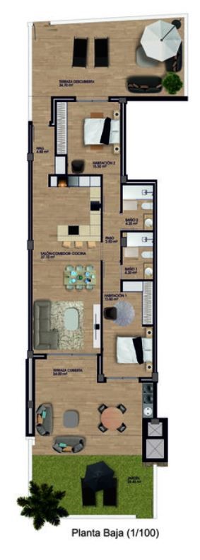 Dit gelijkvloers appartement in Residentie Jaya biedt een perfecte combinatie van modern comfort, hoogwaardige afwerking en een rustige ligging midden in het groene hart van de golfbaan Font del Llop. De woning beschikt over 2 slaapkamers en 2 badkamers, met een ruime leefruimte en een open keuken die volledig uitgerust is met toestellen van Siemens. Grote schuiframen verbinden de woonkamer met het terras en de aangrenzende tuin, vanwaar je rechtstreeks toegang hebt tot de gemeenschappelijke faciliteiten via een privépoortje.