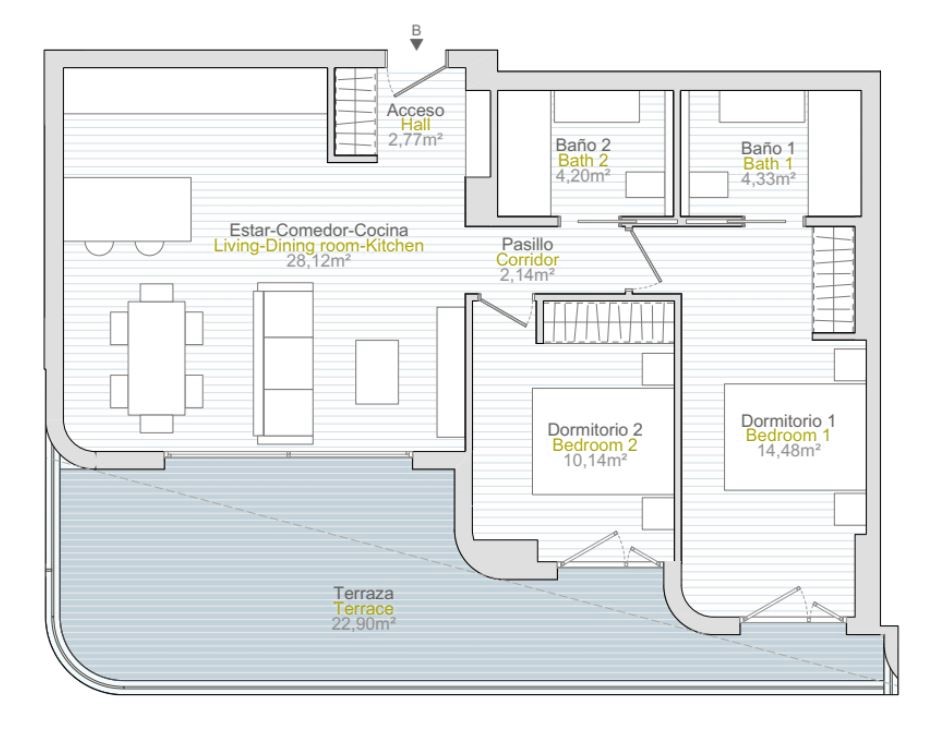 Deze woningen zijn gelegen in Villajoyosa in de noordelijke Costa Blanca. De woningen zijn gelegen op wandelafstand van het strand en genieten van prachtig zeezicht. Deze woning is gelegen op een de begane vloer en is voorzien van 2 slaapkamers met 2 badkamers.