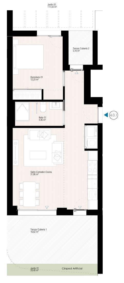 Deze woning is gelegen op de gelijkvloerse verdieping en is voorzien van 1 slaapkamer met 1 badkamer. De slaapkamer heeft rechtstreekse toegang tot het terras. De hoofdslaapkamer heeft een badkamer-ensuite. Elke slaapkamer is voorzien van inbouwkasten met hangrekken, legplanken en lades alsook manuele rolluiken / gordijnen. Elke badkamer is voorzien van een wastafel, douche, doucheschermen, badkamermeubel en toilet. Er is vloerverwarming in de badkamer.