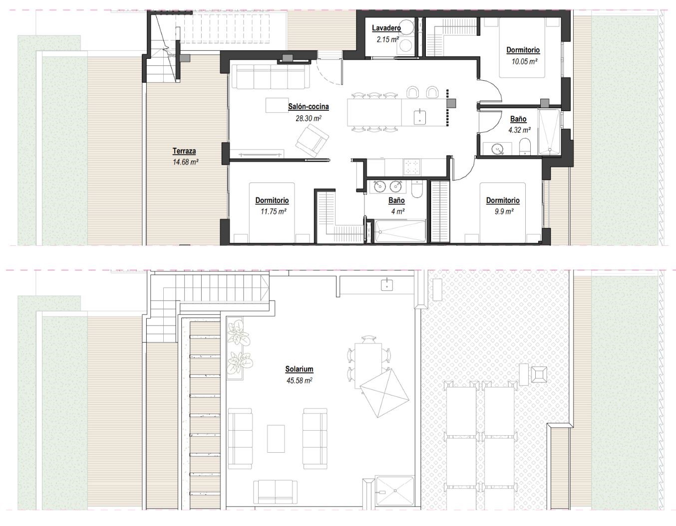 Er is veel buitenruimte voorzien. Op de eerste verdieping is er een terras voorzien van 15m². Via de buitentrap bereik je jouw solarium van maar liefst 45m². Hier kan je de hele dag door genieten van de zon en prachtige zonsondergangen.