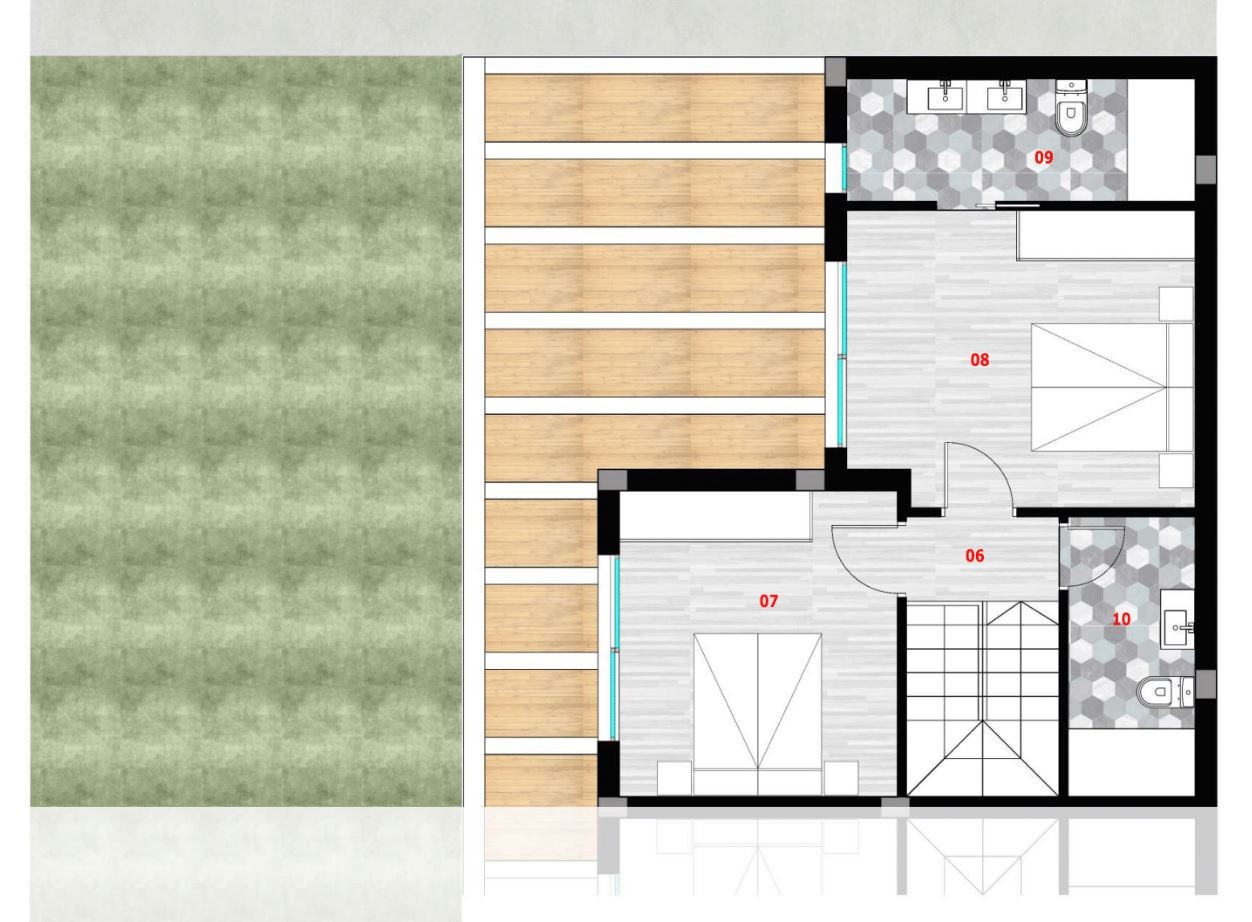 De eerste verdieping volledig privaat is, met twee slaapkamers die elk een eigen badkamer hebben – ideaal voor gasten of koppels die ruimte waarderen.