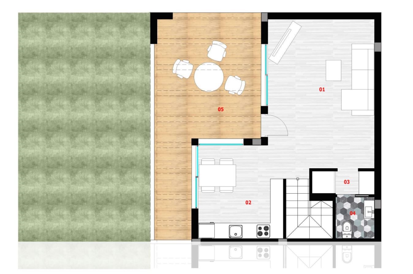 We beginnen allereerst met de gelijkvloerse verdieping. Daar is het ruime terras gelegen van 26m². Verder loop je door naar de woonkamer, waar de open keuken ook is gelegen. Toch is de keuken wat afgescheiden doordat de keuken om de hoek gelegen is. De keuken is voorzien van alle apparaten én kijkt via grote ramen uit op het grote terras.
