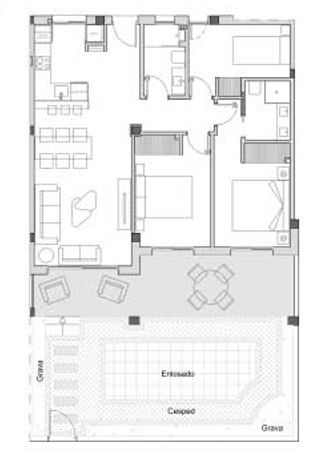 Dit gelijkvloerse appartement beschikt over 3 slaapkamers en 2 badkamers en biedt alles voor comfortabel wonen onder de Spaanse zon. Er is een privéparkeerplaats met pré-installatie voor een elektrische poort, en optioneel kan een automatische poort met afstandsbediening worden voorzien. Aansluitend bevindt zich een berging met extra opbergruimte.