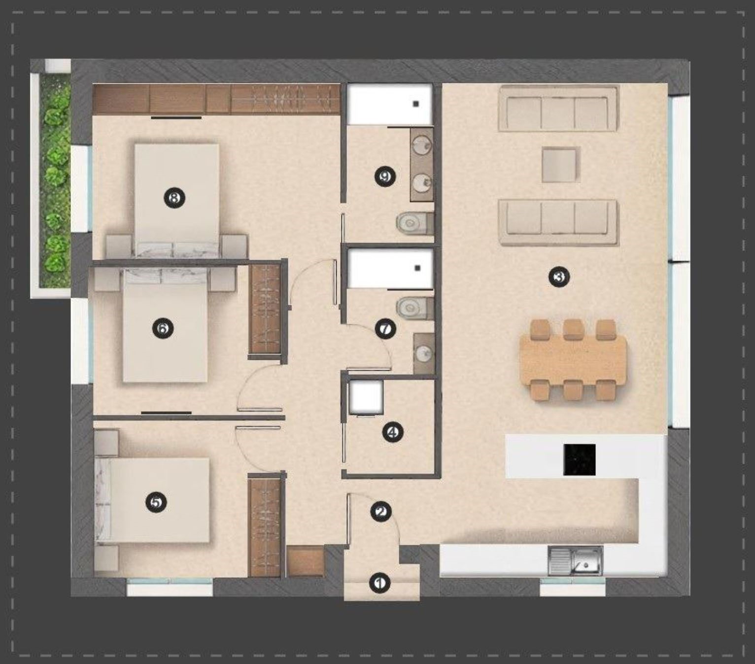 De villa beschikt over drie volwaardige slaapkamers en twee badkamers, waaronder een master bedroom met en-suite badkamer. Alle badkamers zijn volledig afgewerkt en uitgerust met elektrische vloerverwarming, wat het wooncomfort merkbaar verhoogt. Inbouwkasten in elke slaapkamer zorgen voor een strakke afwerking en optimaal gebruik van de ruimte, ideaal voor zowel permanente bewoning als tweede verblijf.