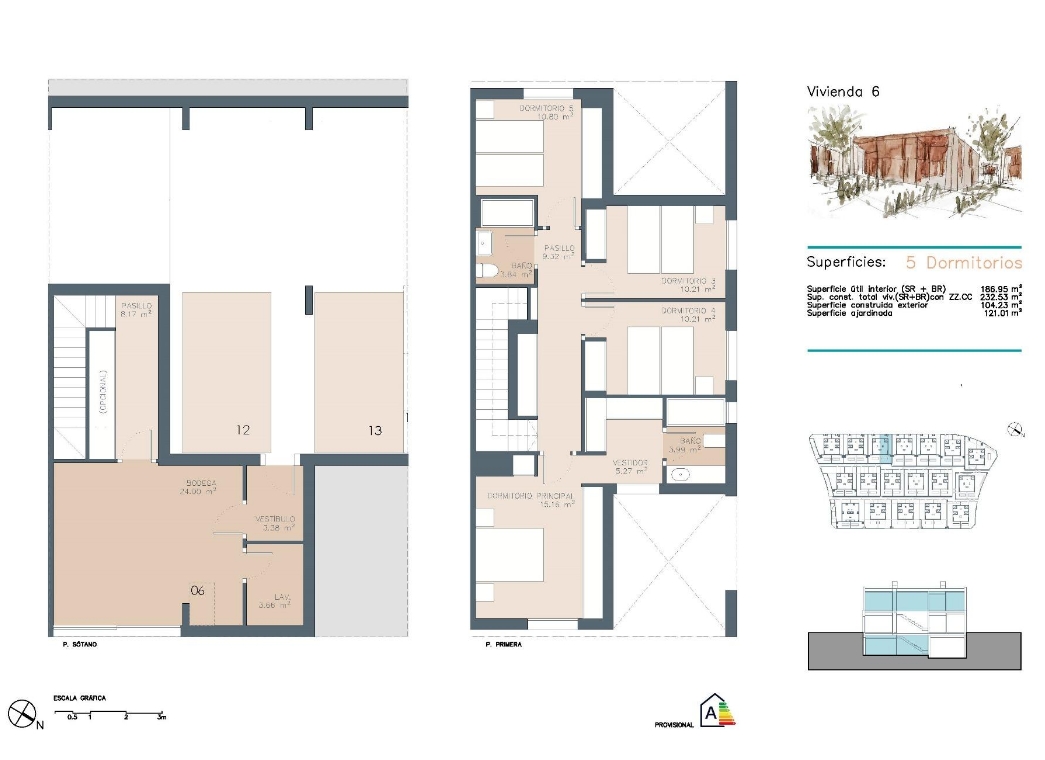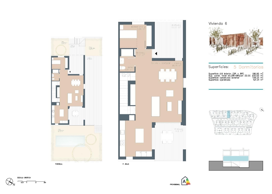 Deze halfvrijstaande woning heeft 5 slaapkamers met 3 badkamers. Er is een ruime leefruimte voorzien met open keuken en kookeiland. De keuken is uitgerust met volgende elektrische apparaten: inductiekookplaat, dampkap, elektrische oven, magnetron en keramisch werkblad. Alle keukens hebben geïntegreerde LED-verlichting. Vanuit de woonkamer kijk je via grote schuiframen uit op jouw privétuin met optioneel een zwembad.