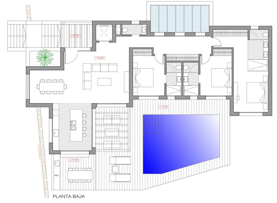 Buiten geniet je van een prachtig aangelegde tuin in Ibiza-stijl met een privézwembad van 38 m² en een buitenkeuken met barbecue, perfect voor lange zomerdagen. De villa is uitgerust met vloerverwarming, zonnepanelen, lift, domotica en hoogwaardige afwerking doorheen de hele woning. Villa Solis is een zeldzame combinatie van architecturale finesse, comfort en ligging, ideaal voor wie op zoek is naar een luxueuze woning in een van de meest gegeerde regio’s van de Costa Blanca.
