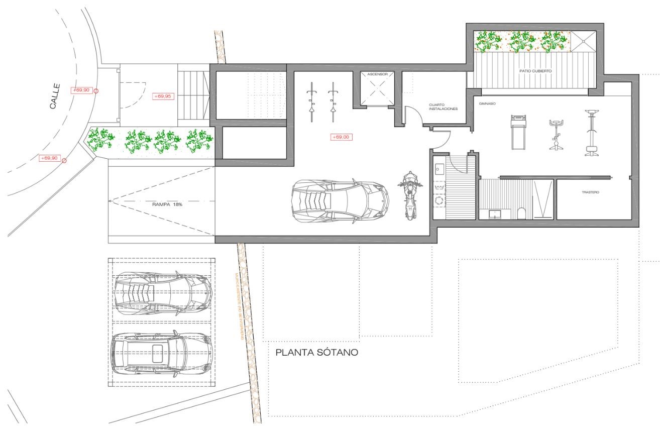 In de onderbouw, is er een ruime garage voorzien met plaats voor een wagen, moto, fietsen, ... Noem maar op! Verder is de eerste opbergruimte voor technische installaties gelegen. In de onderbouw is er ook een badkamer gelegen met wastafel, bijpassend meubel, toilet én douche. Deze badkamer ligt aansluitend aan de fitnessruimte, die uitkijkt op de Engelse patio.