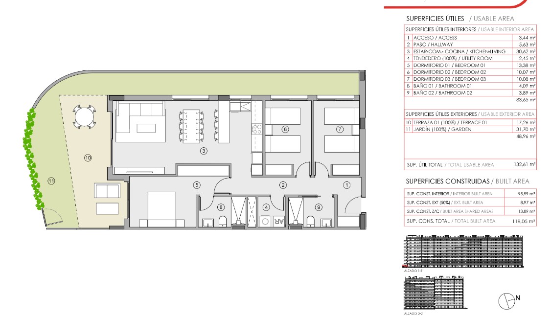 De hoofdslaapkamer heeft een badkamer-ensuite en rechtstreekse toegang tot de tuin. Daarnaast is er ook nog een tweede badkamer ter beschikking. Dankzij het aangelegde terras van 17m² en de groene tuin van 31m² geniet je van een royale buitenruimte die ideaal is om te ontspannen, te loungen of te genieten van de Spaanse zon. De woning voelt ruim aan en combineert comfort met een doordachte indeling.