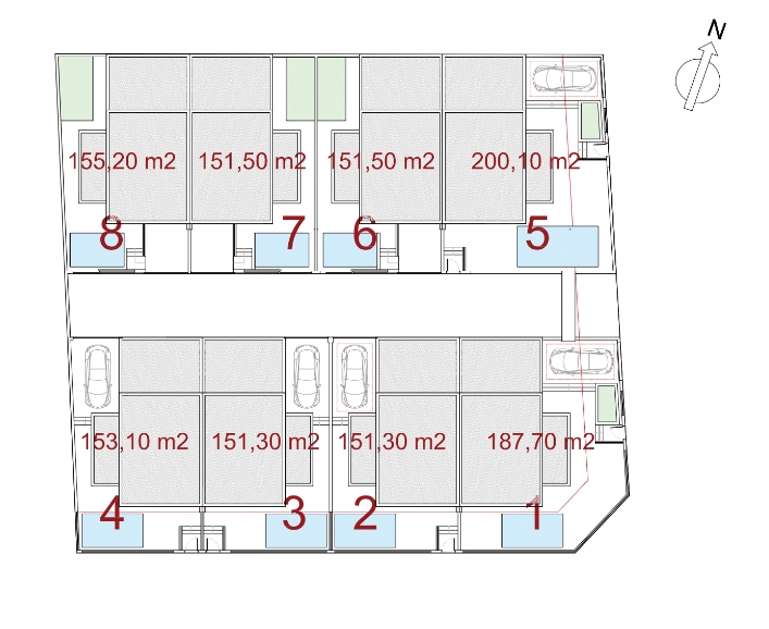 Elke villa beschikt over een eigen zwembad, perfect om te ontspannen op warme dagen, en een parkeerplaats voor gemakkelijke toegang. Het terras van 36 m² biedt voldoende ruimte voor buiten dineren of loungen, omringd door een onderhoudsvriendelijke tuin van 155 m².