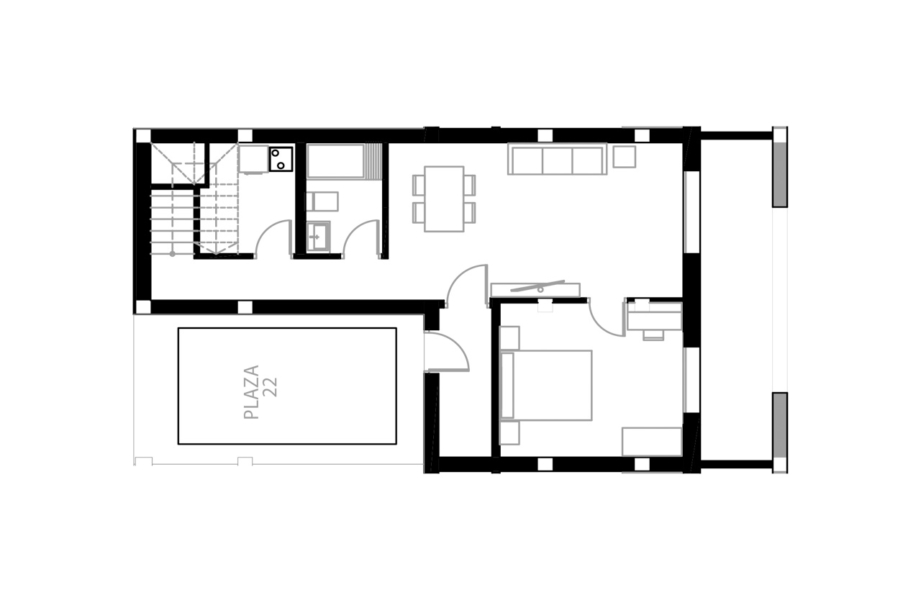 Deze woning is verdeeld over 2 verdiepingen. Op de eerste verdieping zijn alle leefruimtes voorzien. Er zijn 2 slaapkamers met 2 badkamers voorzien. Alle slaapkamers zijn voorzien van inbouwkasten. Er is een ruime leefruimte voorzien, met een open keuken. De keuken is volledig uitgerust. De keuken is voorzien van de volgende apparaten: oven, magnetron, vaatwasser, keramische kookplaat, dampkap, wasmachine en koelkast. Alle lades zijn voorzien van een gedempt systeem. Als je naar buiten gaat op de eerste verdieping vind je jouw terras van ruim 22m².