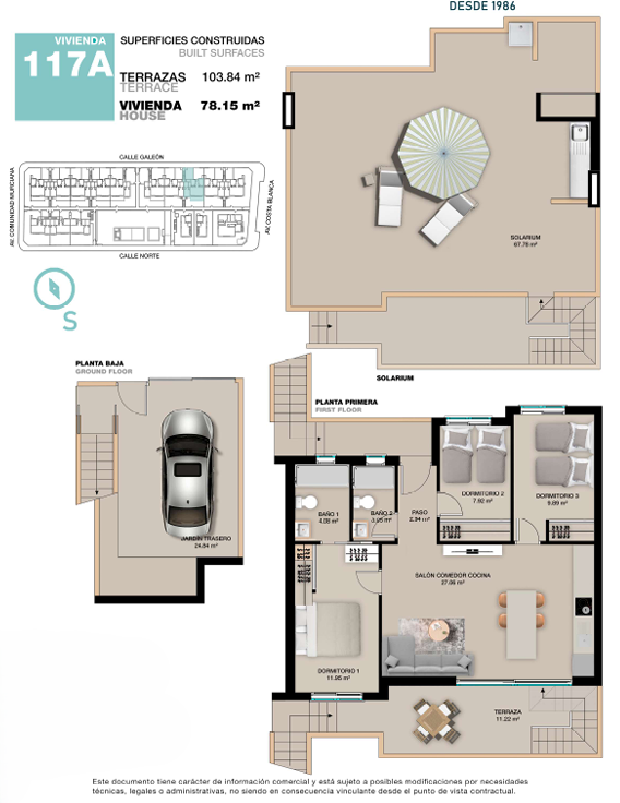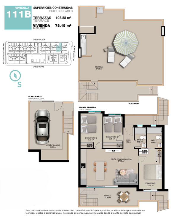 Deze woning is gelegen op de eerste verdieping. Het penthouse heeft 3 slaapkamers en 2 badkamers. De ingang van de woning ligt op de begane vloer. Daar is er een poort om jouw wagen te parkeren en een voetgangersingang. Via een trap bereik je de eerste verdieping.