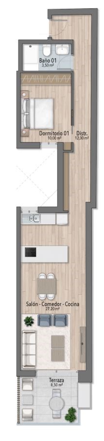 Moderne appartementen met oog op een stijlvolle afwerking en maximum comfort: Deze penthouse bevindt zich op de hoogste verdieping en bevat 1 slaapkamer en 1 badkamer. De leefruimte biedt plaats voor een gezellige zithoek die aansluit op de afgewerkte open keuken; voorzien van trendy ontbijtbar, opbergkasten, werktafel en pré-installatie voor het aansluiten van alle benodigde keukentoestellen. De slaapkamer biedt plaats voor 2-persoonsbedden en zijn tevens voorzien van praktische inbouwkasten waardoor geen enkele ruimte verloren gaat. De badkamer heeft een kwalitatieve douche, bijpassend badkamermeubel met LED verlichting en toilet. Een prachtig royaal privé terras van maar liefst 8.5m² met zeezicht wacht jou alvast op!