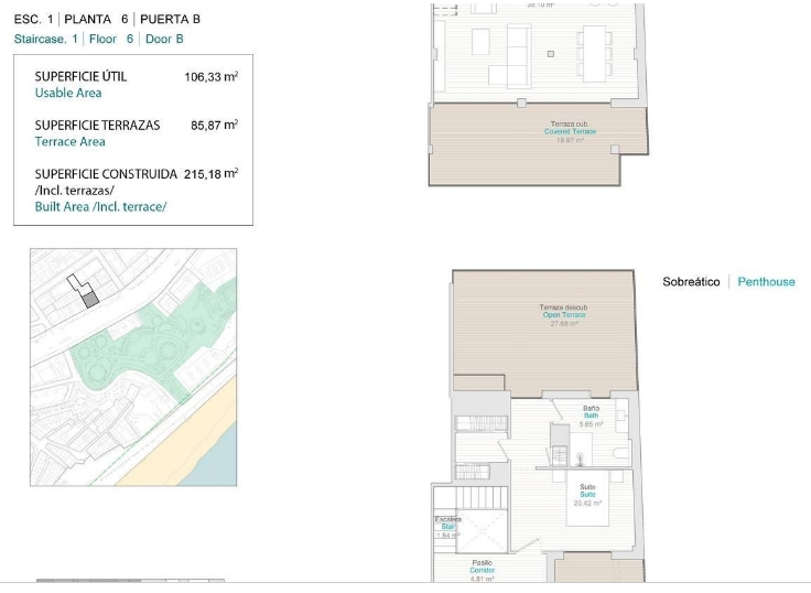 Dit appartement is voorzien van 3 slaapkamers en 2 badkamers en verdeeld over 2 verdiepingen. Op de onderste verdieping is er een ruime leefruimte met open keuken. De keuken is voorzien van een kookeiland. Vanuit de woonkamer kijk je via grote terrassen van 20m² uit op het stadscentrum en de Middellandse zee. Alle slaapkamers zijn voorzien van inbouwkasten met hangrekken en lades. De eerste en tweede slaapkamer is gelegen op de onderste verdieping. Elke slaapkamer heeft een eigen badkamer, de tweede slaapkamer heeft een badkamer-ensuite. De badkamer is uitgerust met toilet, wastafel, douche en doucheschermen.