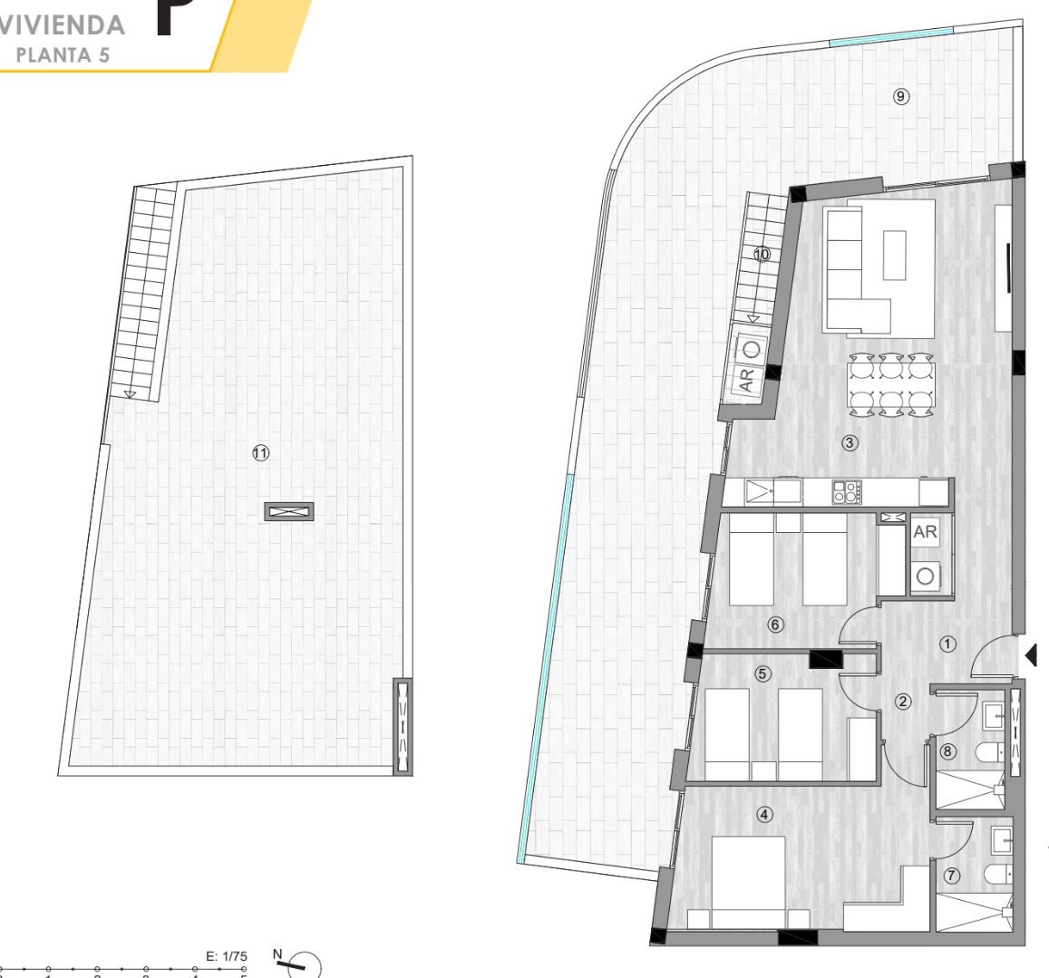 Dit penthouse is gelegen op de vijfde verdieping van residentie Alegria 25 en beschikt over 3 slaapkamers en 2 badkamers. Bij binnenkomst bereik je de hal die alle ruimtes met elkaar verbindt. De leefruimte is licht en ruim, dankzij de grote schuiframen die uitkomen op het terras van 60m². Het terras loopt over de gehele woning, zodat elke ruimte optimaal belicht wordt.