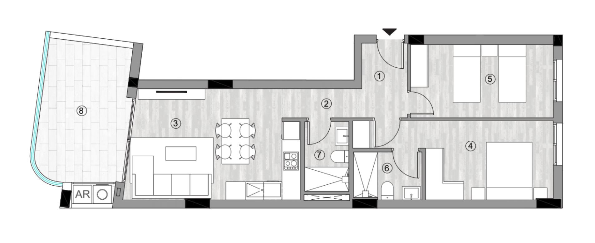 Dit penthouse is gelegen op de vijfde verdieping van residentie Alegria 25 en beschikt over 2 slaapkamers en 2 badkamers. Bij binnenkomst bereik je de hal die alle ruimtes met elkaar verbindt. De leefruimte is licht en ruim, dankzij de grote schuiframen die uitkomen op het terras van 14m². De open keuken heeft een praktische L-vorm en is reeds pré-geïnstalleerd met boven- en onderkasten. Op het terras bevindt zich bovendien een aparte berging met plaats voor de aerothermische boiler en aansluitingen voor wasmachine en droogkast.