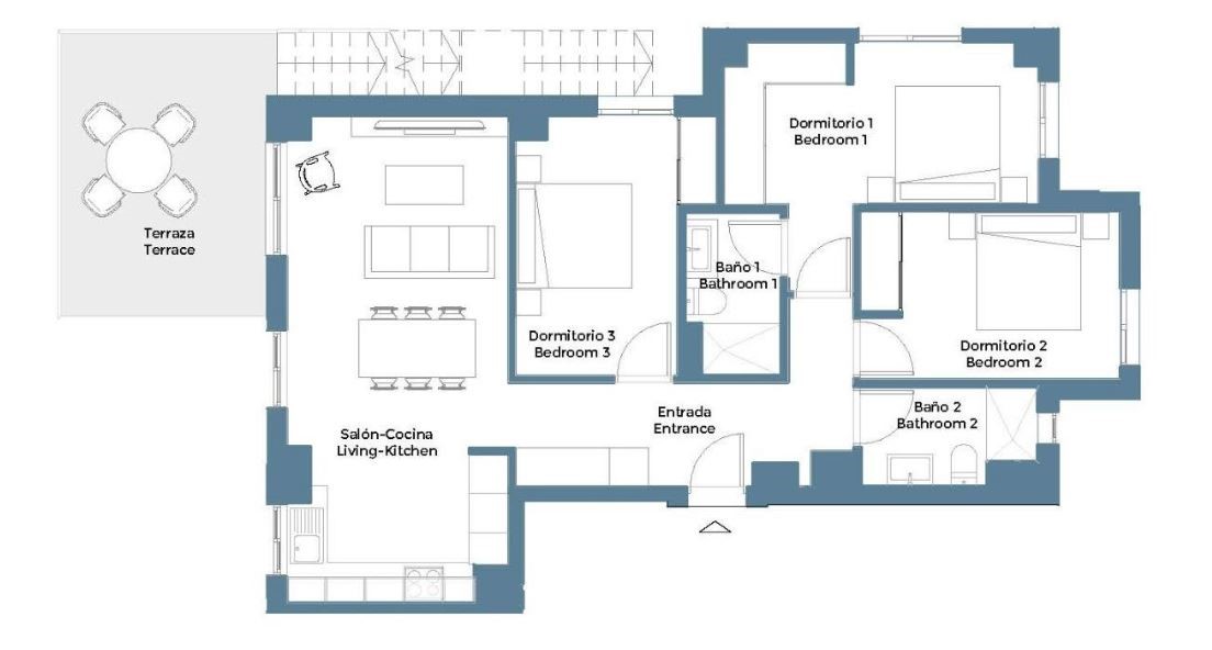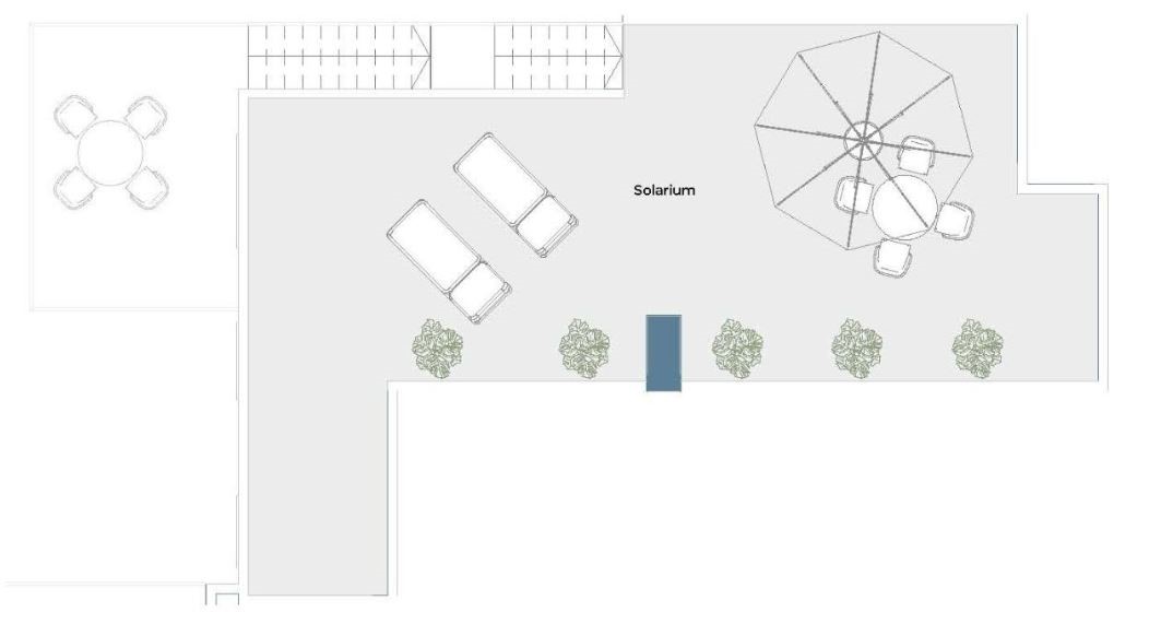 Vanuit de woonkamer heb je toegang via grote schuiframen tot het aanliggend terras. Het terras heeft een oppervlakte van 15m², een heerlijke ruimte waar je gezellig kan vertoeven terwijl je geniet van de Spaanse zon. Een verdieping hoger, bereik je jouw privésolarium van 68m² via een buitentrap. Geniet daar de hele dag door van de zon, dankzij de ideale ligging.