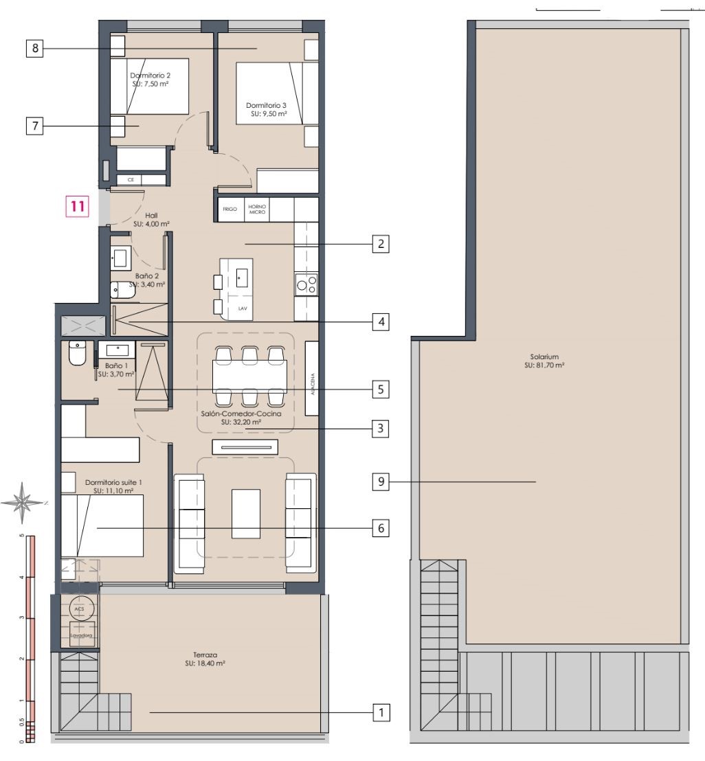Deze woning is gelegen op de bovenste vloer, waardoor deze geniet van een terras & solarium. Aansluitend aan de woonkamer en hoofdslaapkamer is er een aangelegd terras gelegen van 18m². Via de buitentrap bereik je het solarium van 81m². Op het terras is er een berging geplaatst met aerothermische boiler en aansluitingen voor de wasmachine.