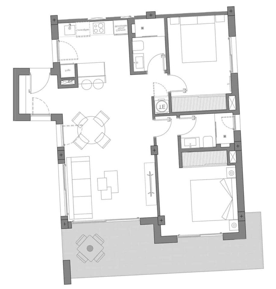 Het appartement heeft 2 slaapkamers met 2 badkamers. Er is 1 hoofdslaapkamer, deze slaapkamer heeft een badkamer-ensuite én een rechtstreekse verbinding met het terras. Zo kan je elke dag wakker worden, met het schitterend zonnetje.